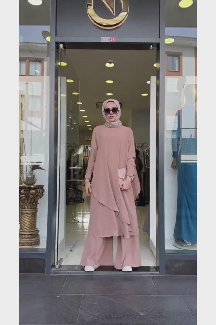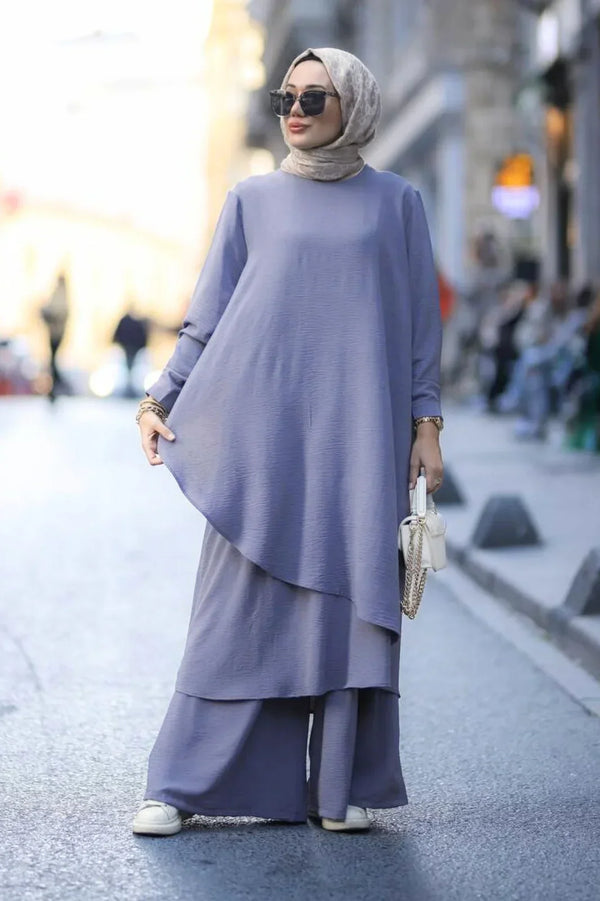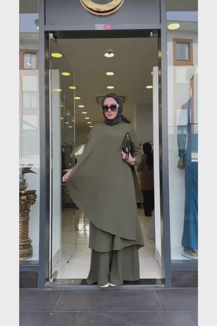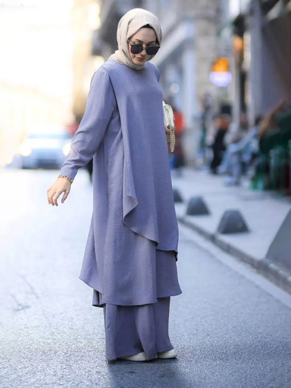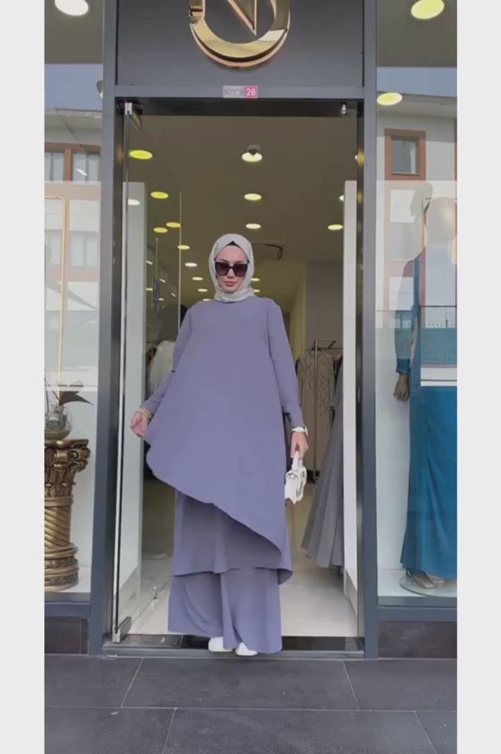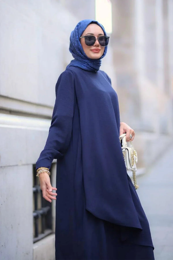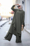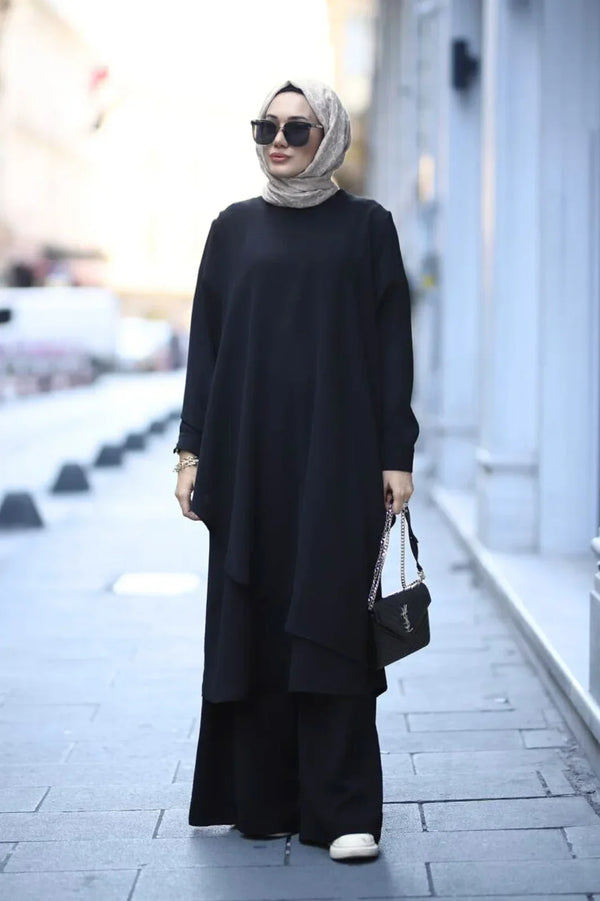 This stylish two-piece set features an elegant tunic with an asymmetrical overlay that drapes gracefully over one side, adding a contemporary twist to its classic design. Paired with loose-fitting pants, it offers a modern, modest look perfect for any occasion.
