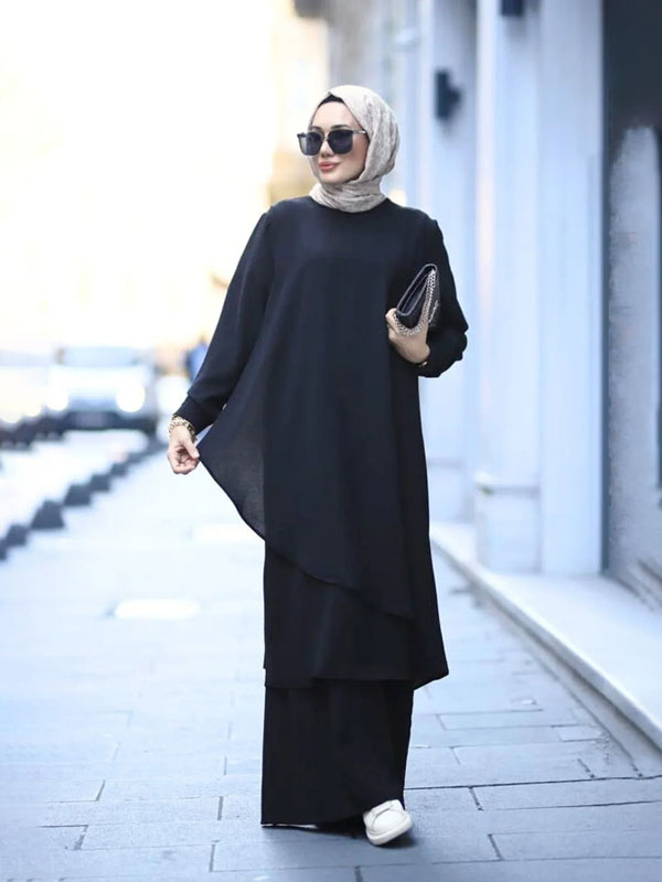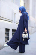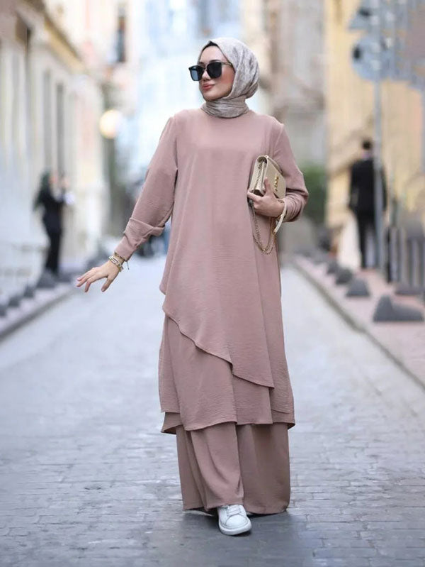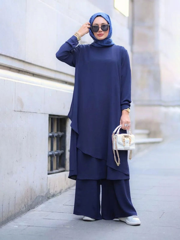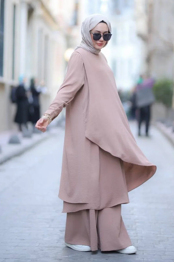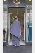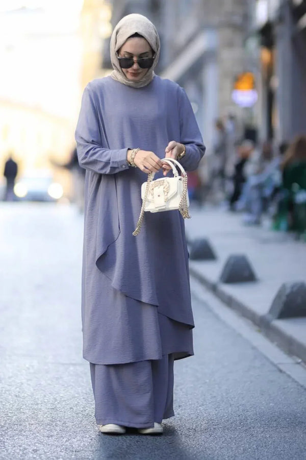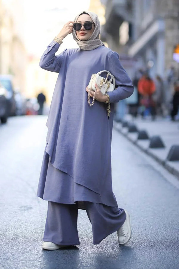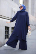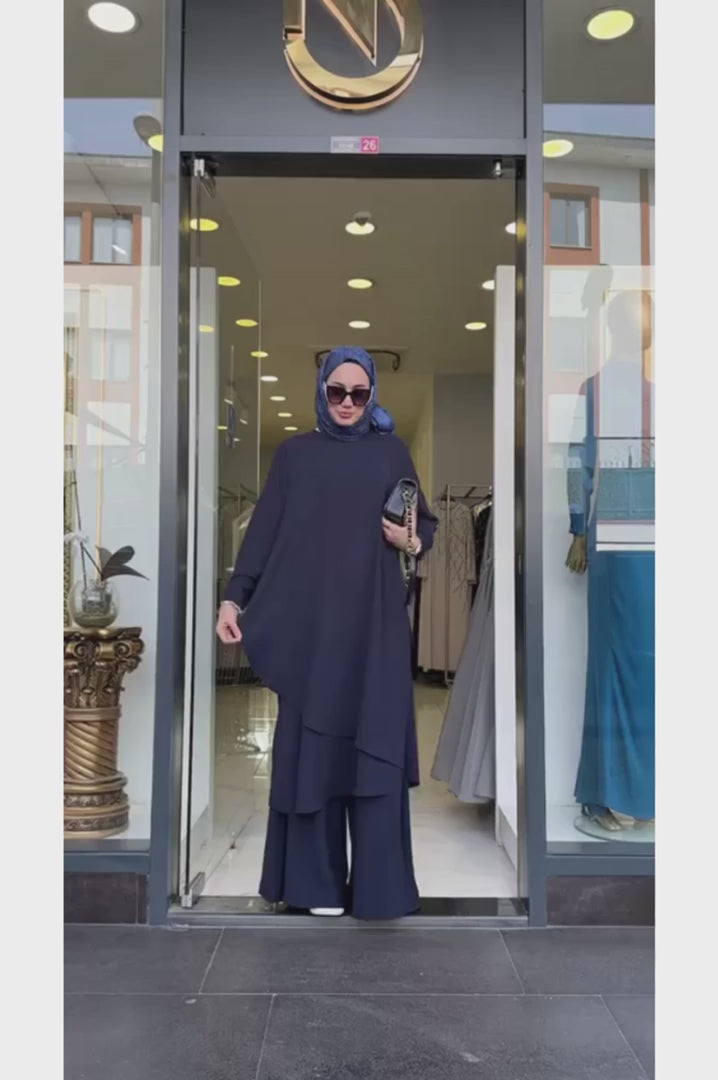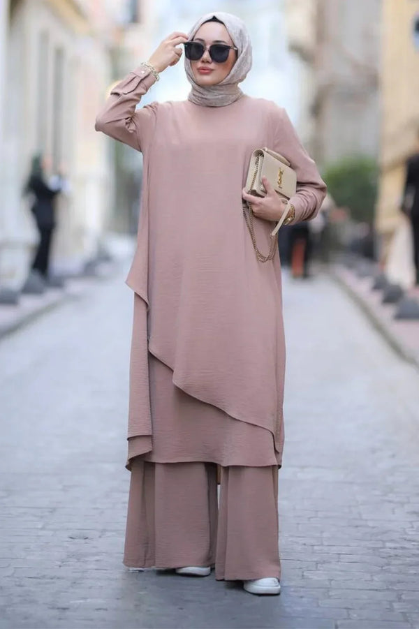 This stylish two-piece set features an elegant tunic with an asymmetrical overlay that drapes gracefully over one side, adding a contemporary twist to its classic design. Paired with loose-fitting pants, it offers a modern, modest look perfect for any occasion.