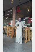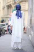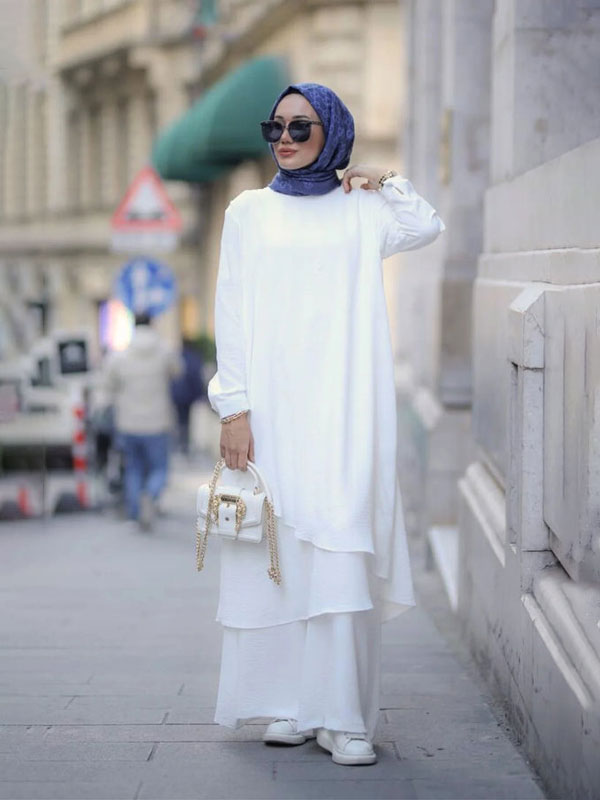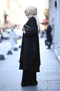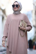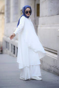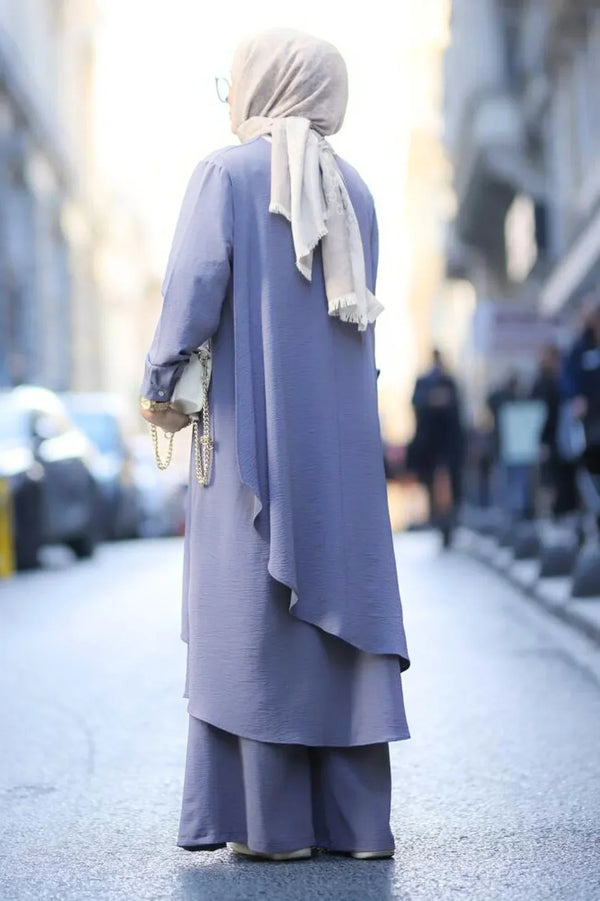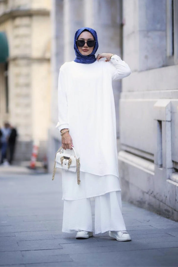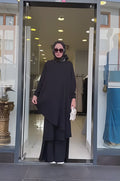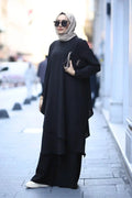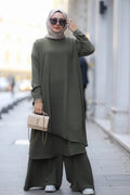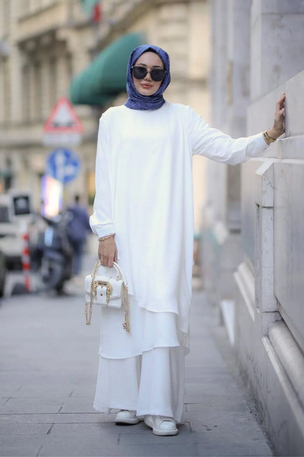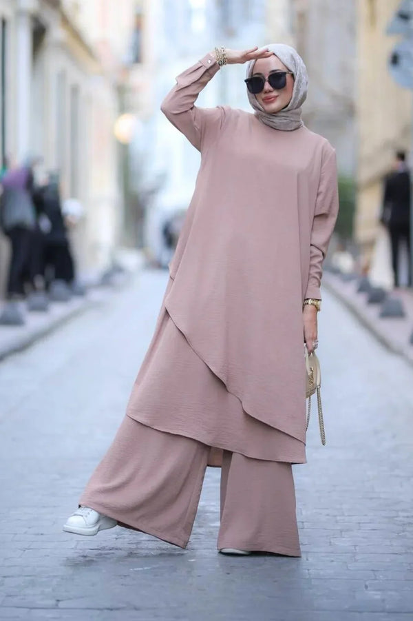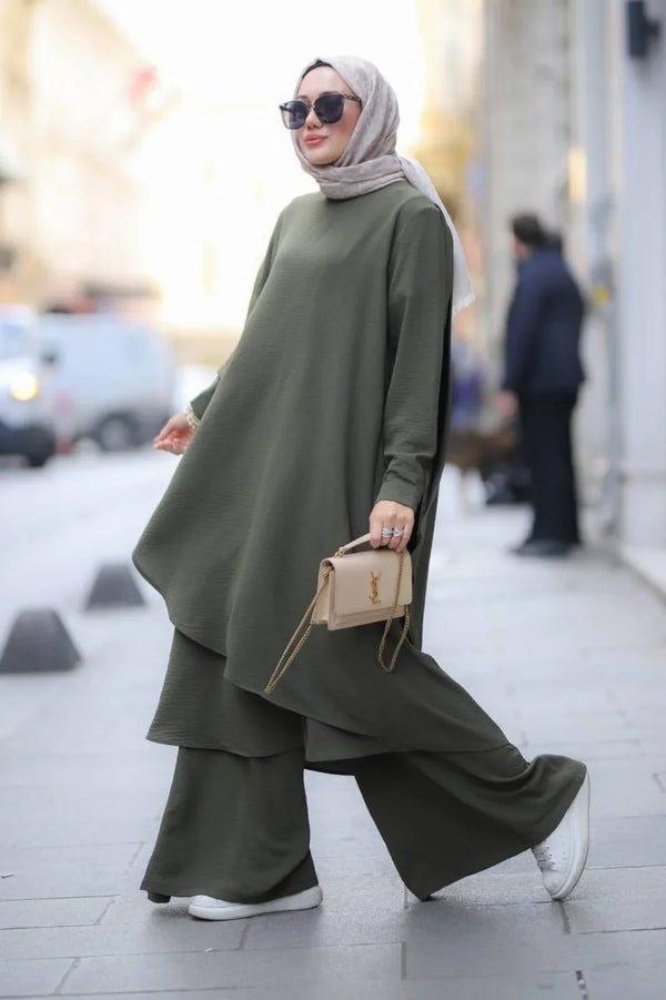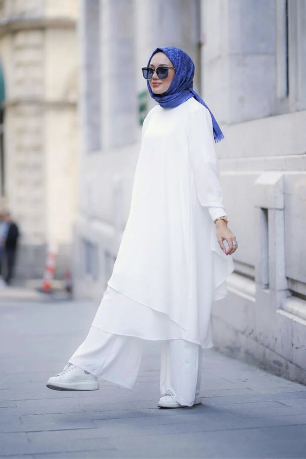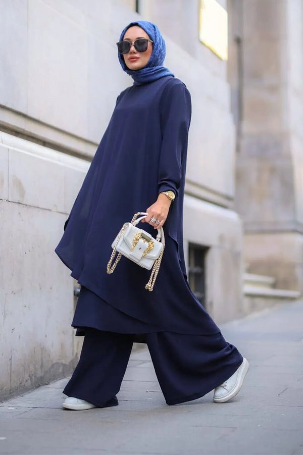 This stylish two-piece set features an elegant tunic with an asymmetrical overlay that drapes gracefully over one side, adding a contemporary twist to its classic design. Paired with loose-fitting pants, it offers a modern, modest look perfect for any occasion.