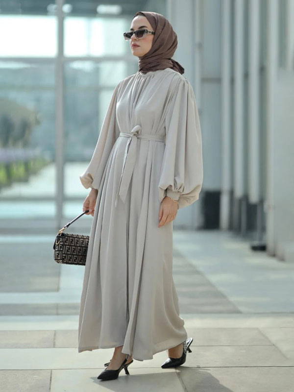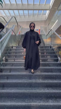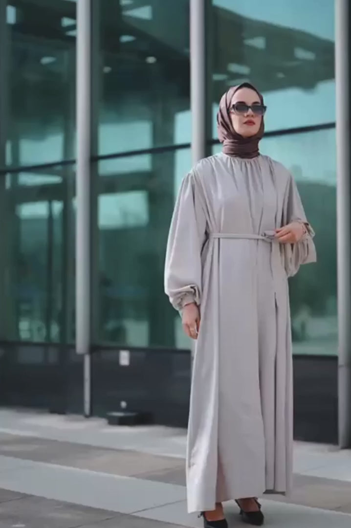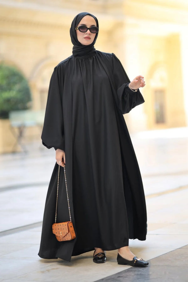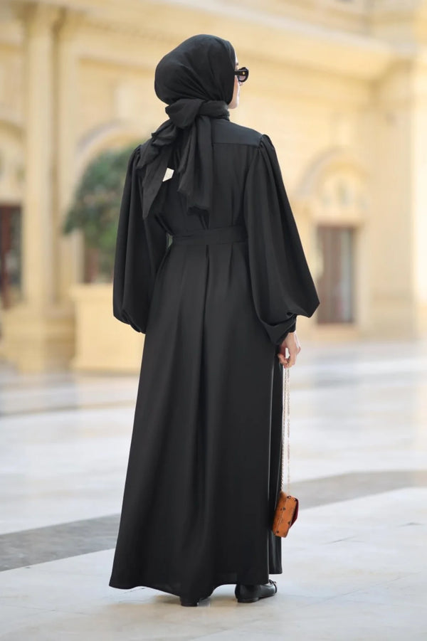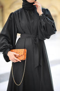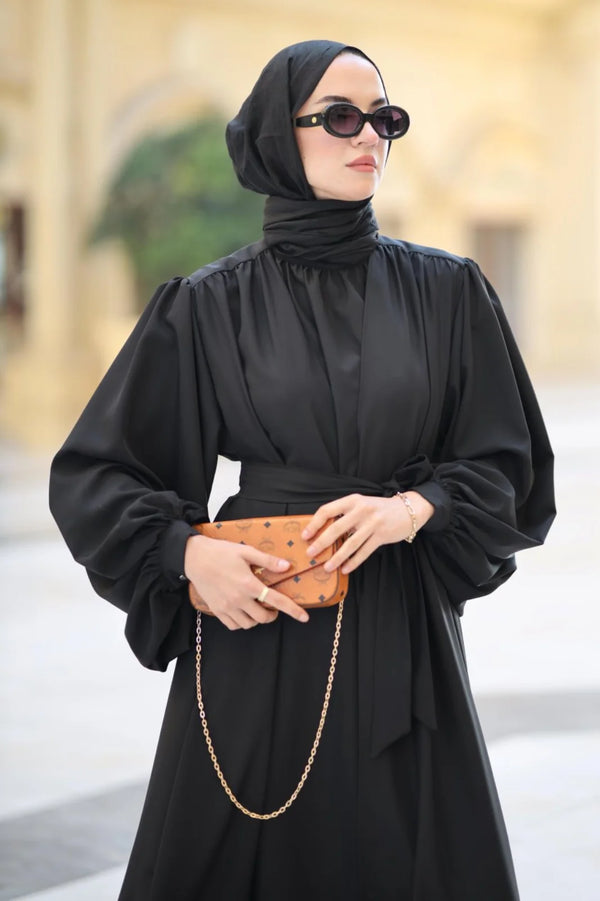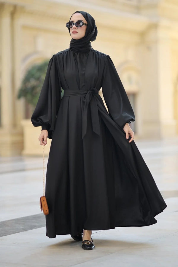 Elegant full-length abaya with voluminous balloon sleeves and a flattering waist tie. Designed with soft pleats for a graceful flow, crafted from smooth, lightweight fabric for all-day comfort.
